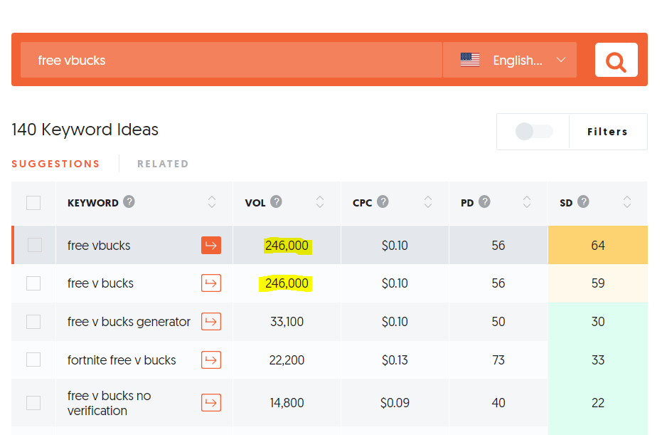 دعنا نتعرف جميعا على معدل البحث عن كلمة “Free Vbucks” شهريا حسب “UberSuggest” فمعدل البحث في امريكا لوحدها قد يصل لازيد من 500.000 بحث
